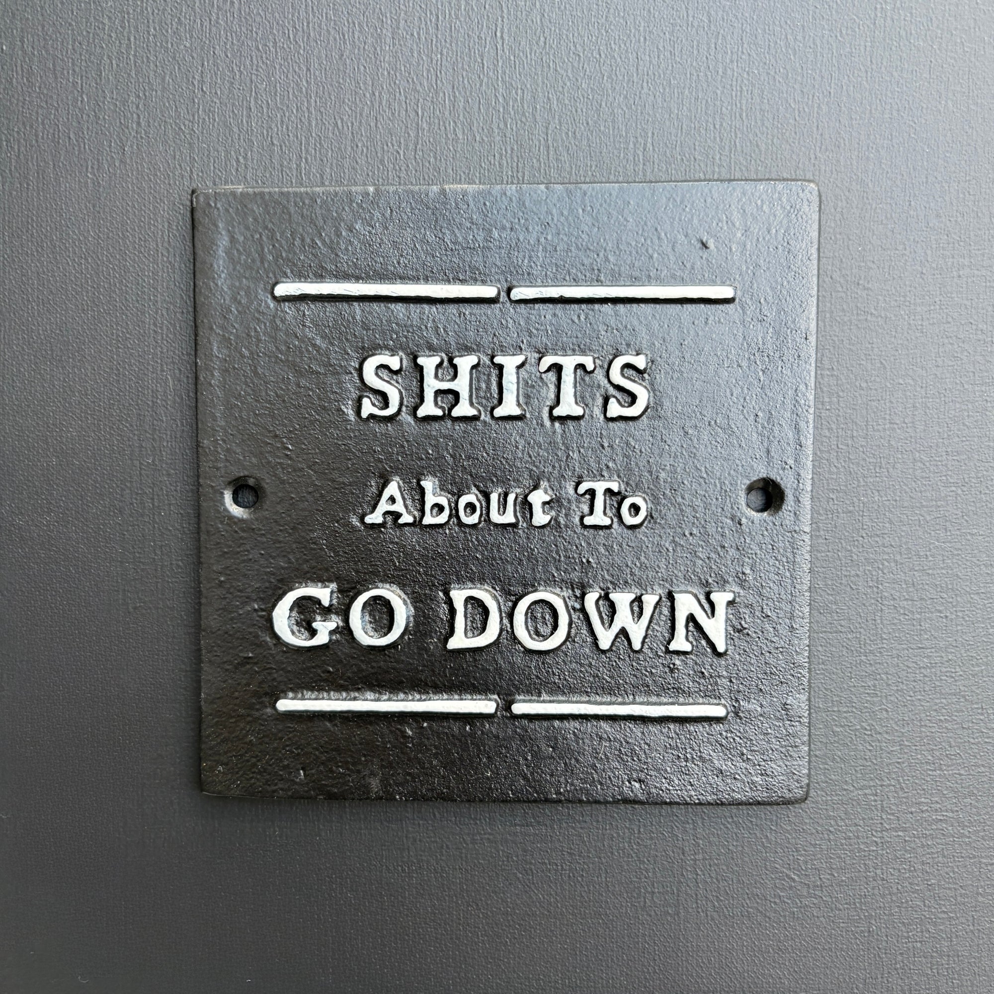 Cheeky, fun, and guaranteed to raise a smile, the Down Sign is a playful home decor piece that stands out in any setting. Crafted from sturdy cast metal, this durable plaque is finished in stylish black with bold white lettering that reads: “SHITS ABOUT TO GO DOWN”. This metal signs simple monochrome design ensures it fits seamlessly into a variety of spaces while still delivering maximum impact.