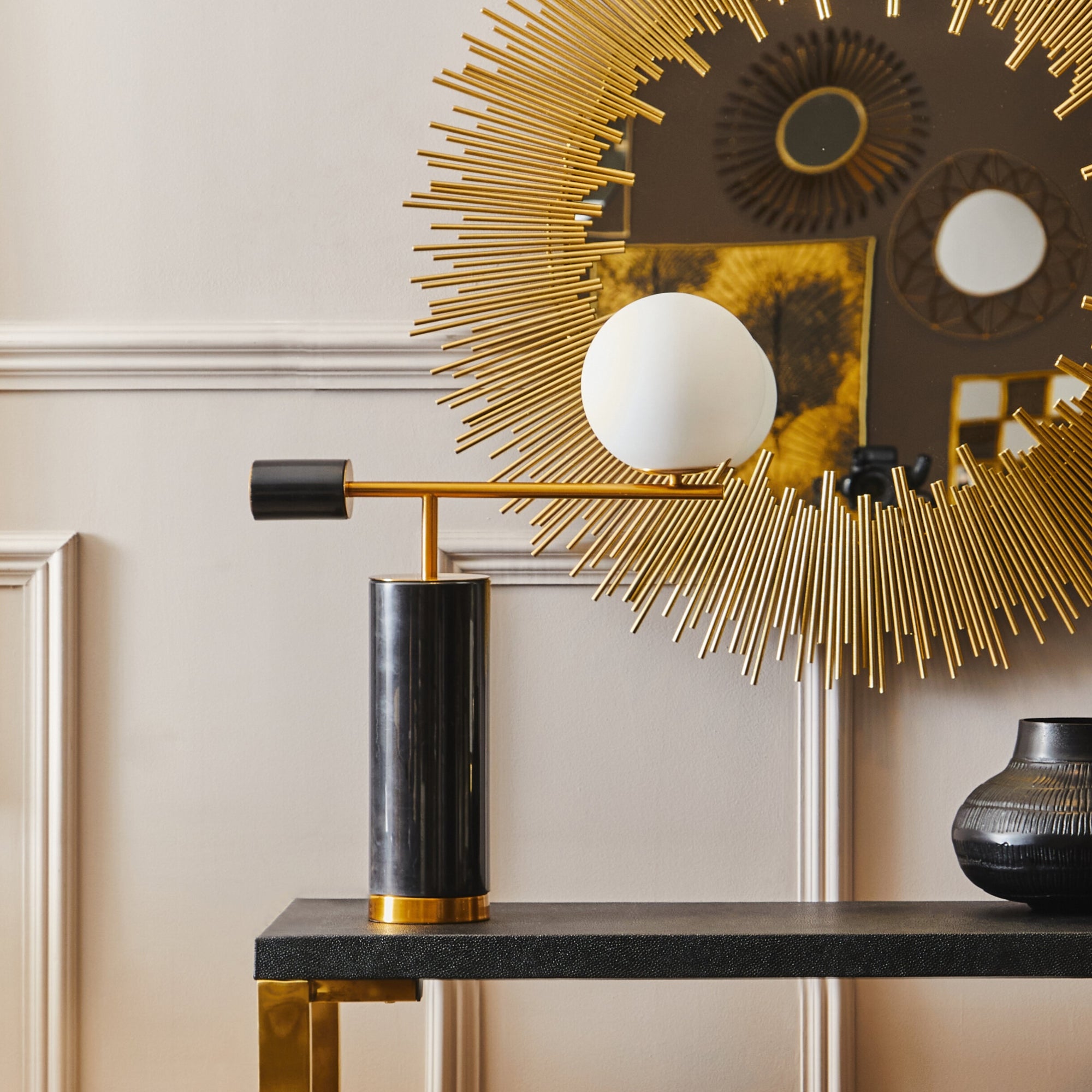 The Marble Table Lamp is a striking blend of modern design and timeless elegance, making it a sophisticated light for any interior space. Its cylindrical body, crafted from natural black marble, provides a bold and grounding base, while the smooth white glass globe shade offers a soft, ambient glow. The pairing of dark, organic stone with the luminous purity of the globe creates a captivating contrast that feels both contemporary and refined.