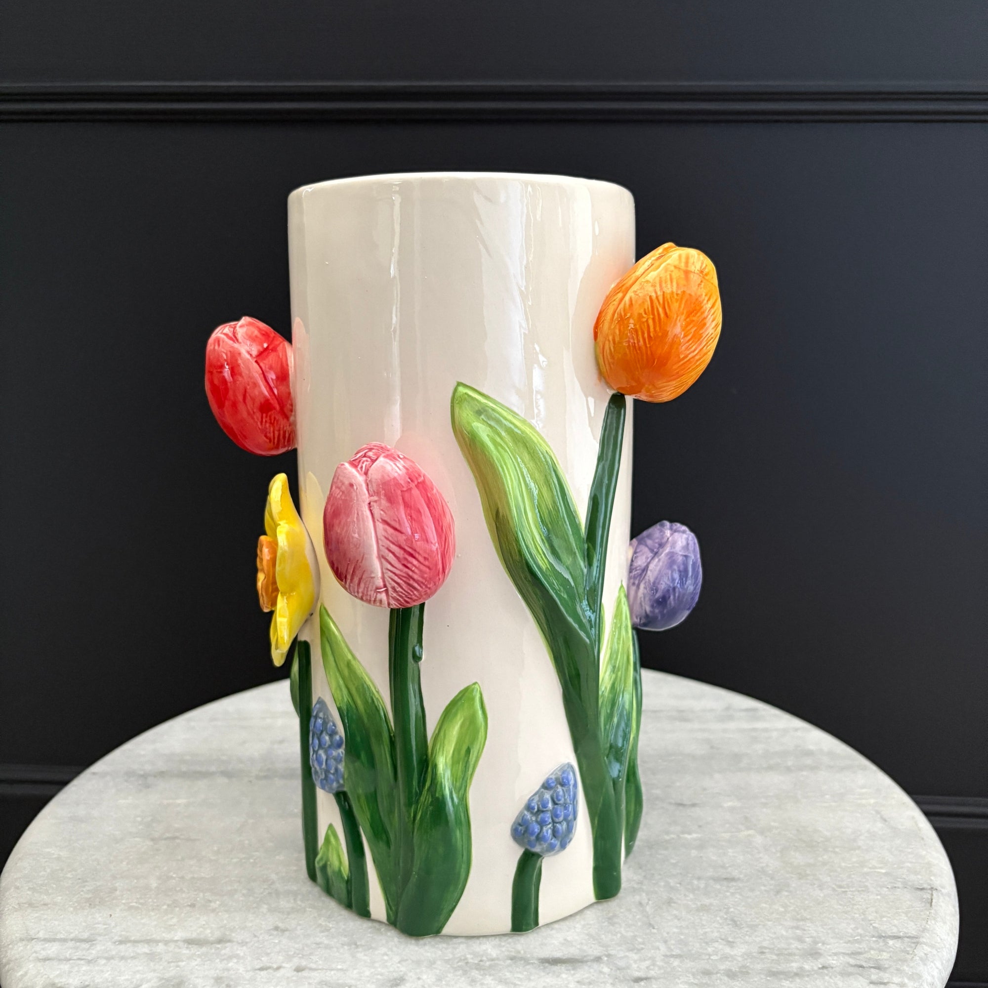 The Ceramic Flower Vase is a vibrant and artistic statement piece designed to bring a burst of colour and charm to any space. Crafted from ceramic, this stunning vase features intricately sculpted flowers in an array of beautiful hues, arranged at varying heights for an eye-catching effect.