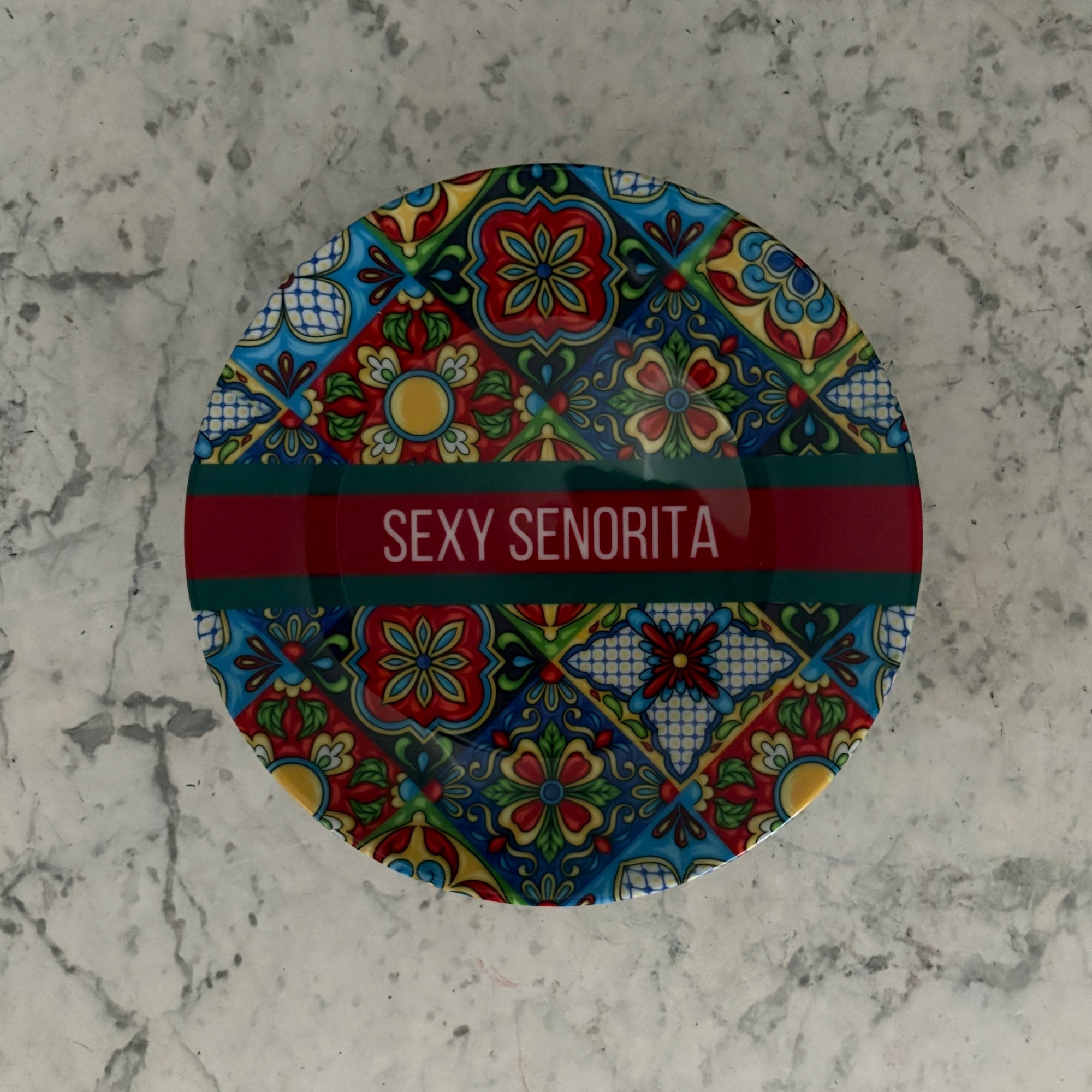 Colourful, charming, and full of personality, this Colourful Plate / Trinket Dish is a bold and playful addition to any space. Featuring vibrant mosaic-inspired tile patterns as the background, it’s adorned with the cheeky phrase "SEXY SENORITA" in crisp white lettering, set against a striking red and green band that runs across the centre—adding flair and confidence to the design.