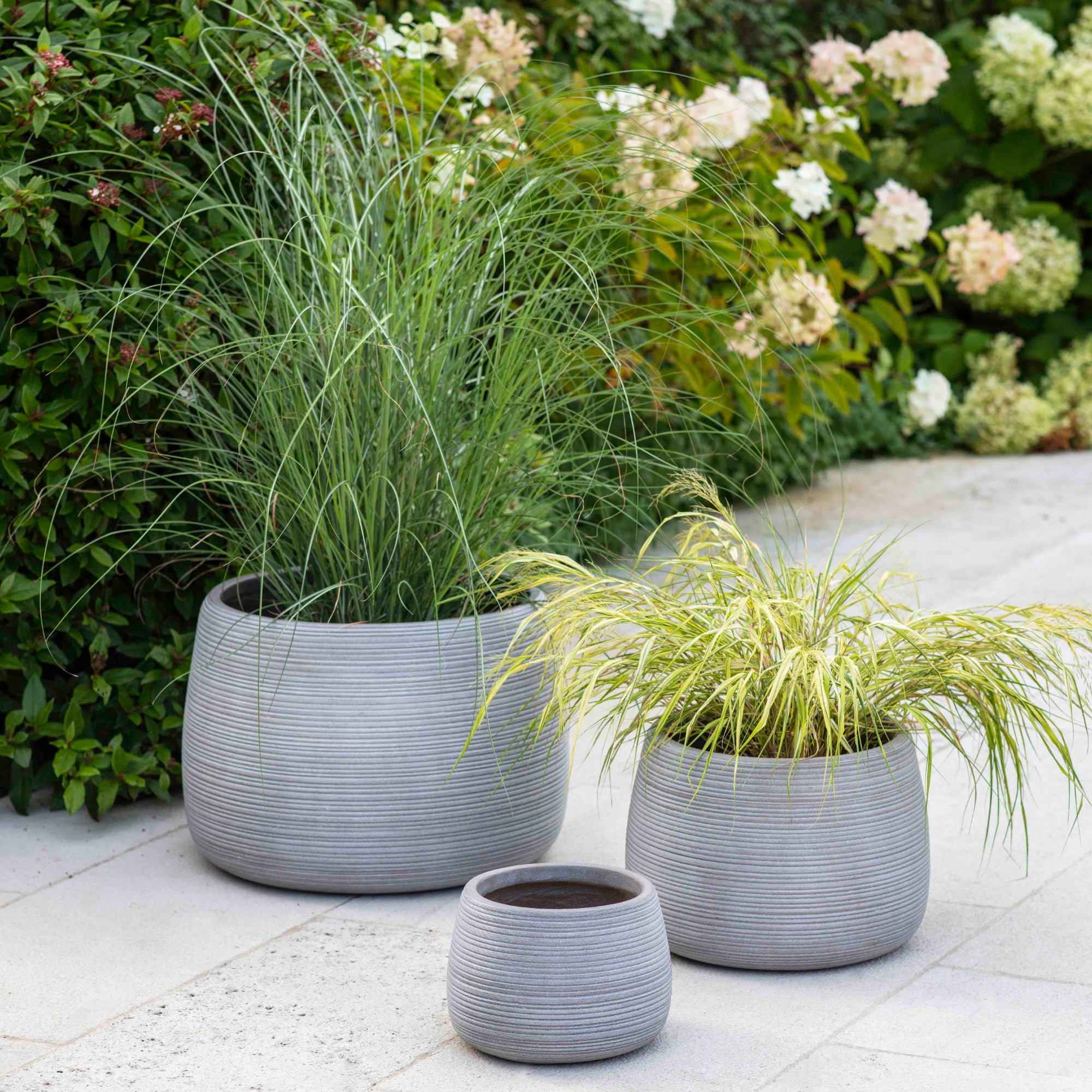 Combining smooth curves and horizontal ridges our set of three Grey Planters bridges the gap between urban and rural living, with the ability to work effortlessly in both spaces. Adds textural interest to your plant displays, these garden pots offer style, durability and strength.