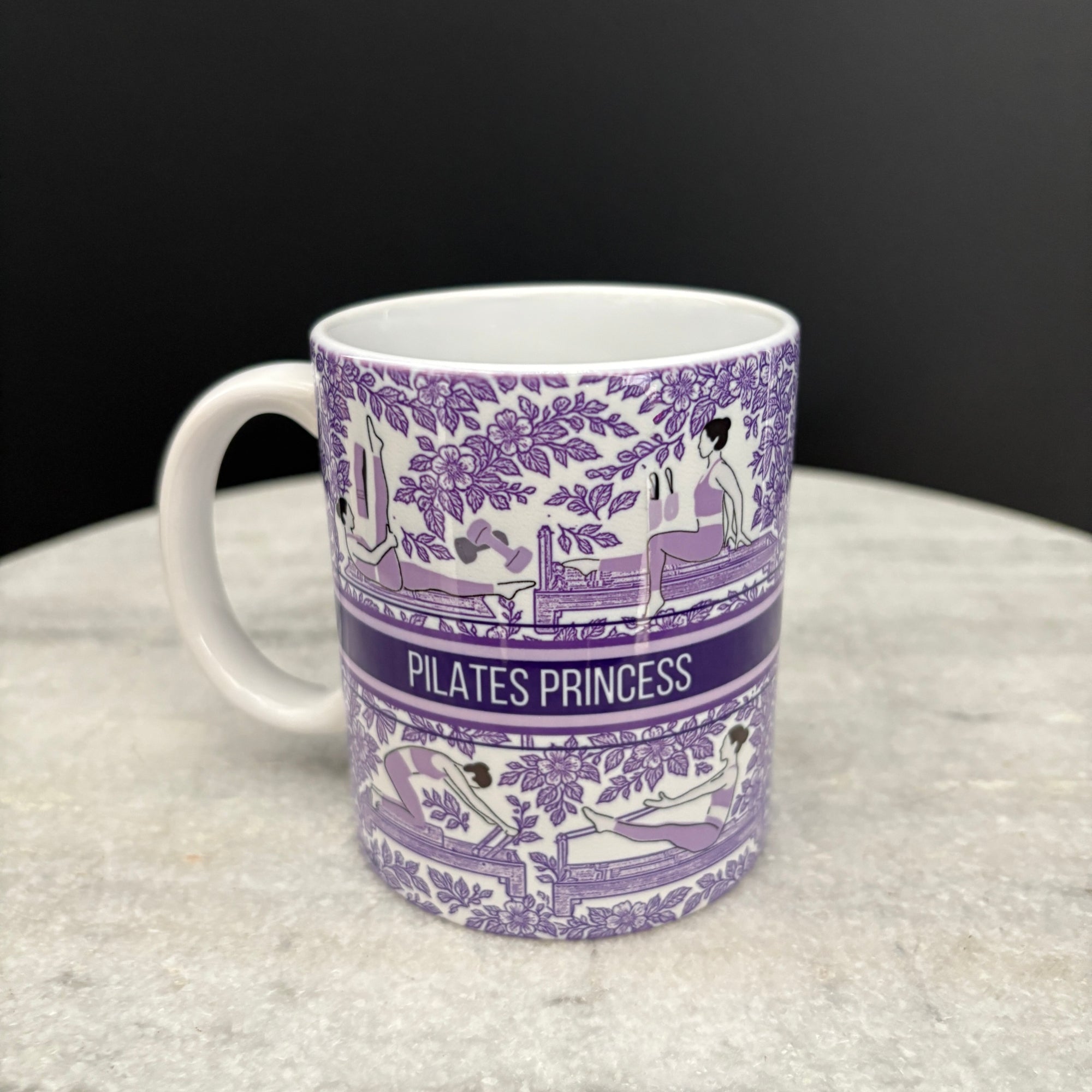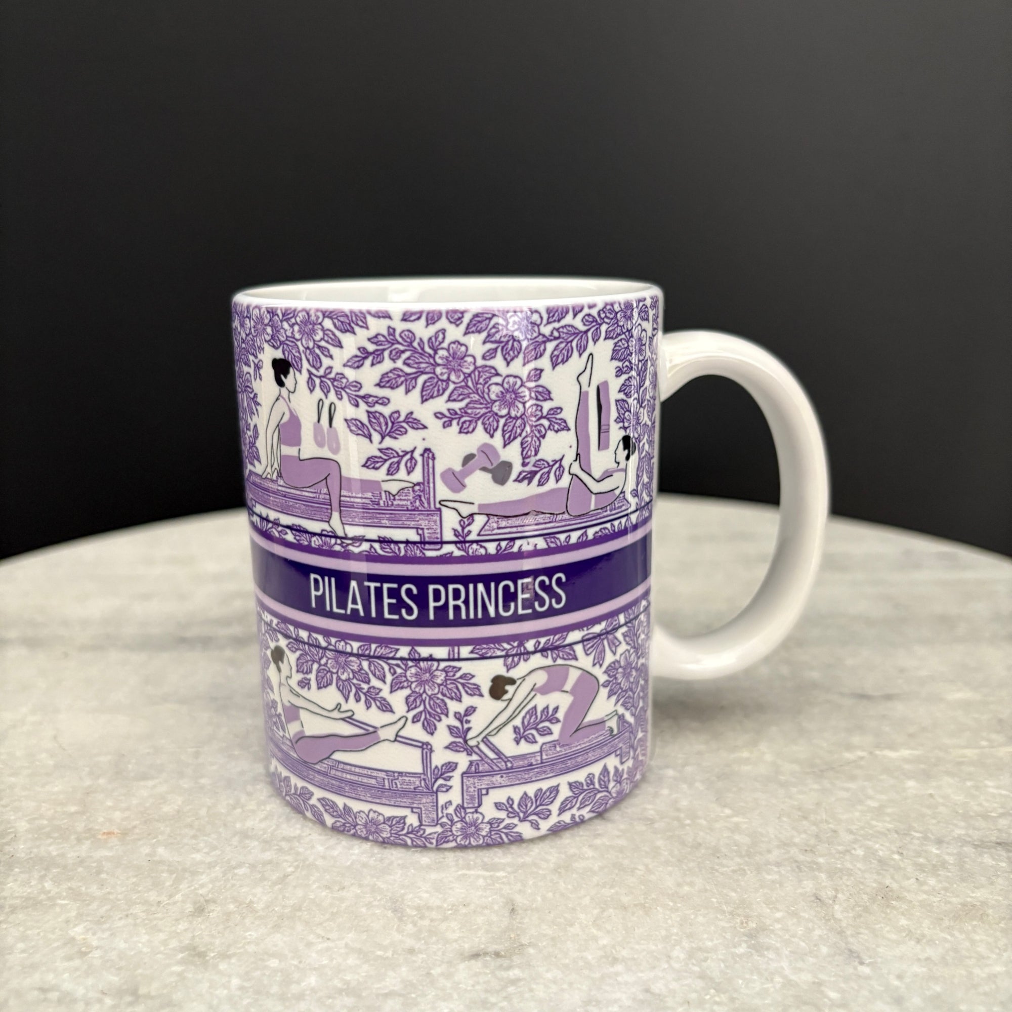 Eye-catching and full of personality, the Princess Mug is the ultimate funny Pilates mug for those who like their caffeine served with a side of charm. Featuring a toile style illustration with a cheeky twist, this purple mug is perfect for reformer Pilates girlies and exercise fans who love to mix style with humour.