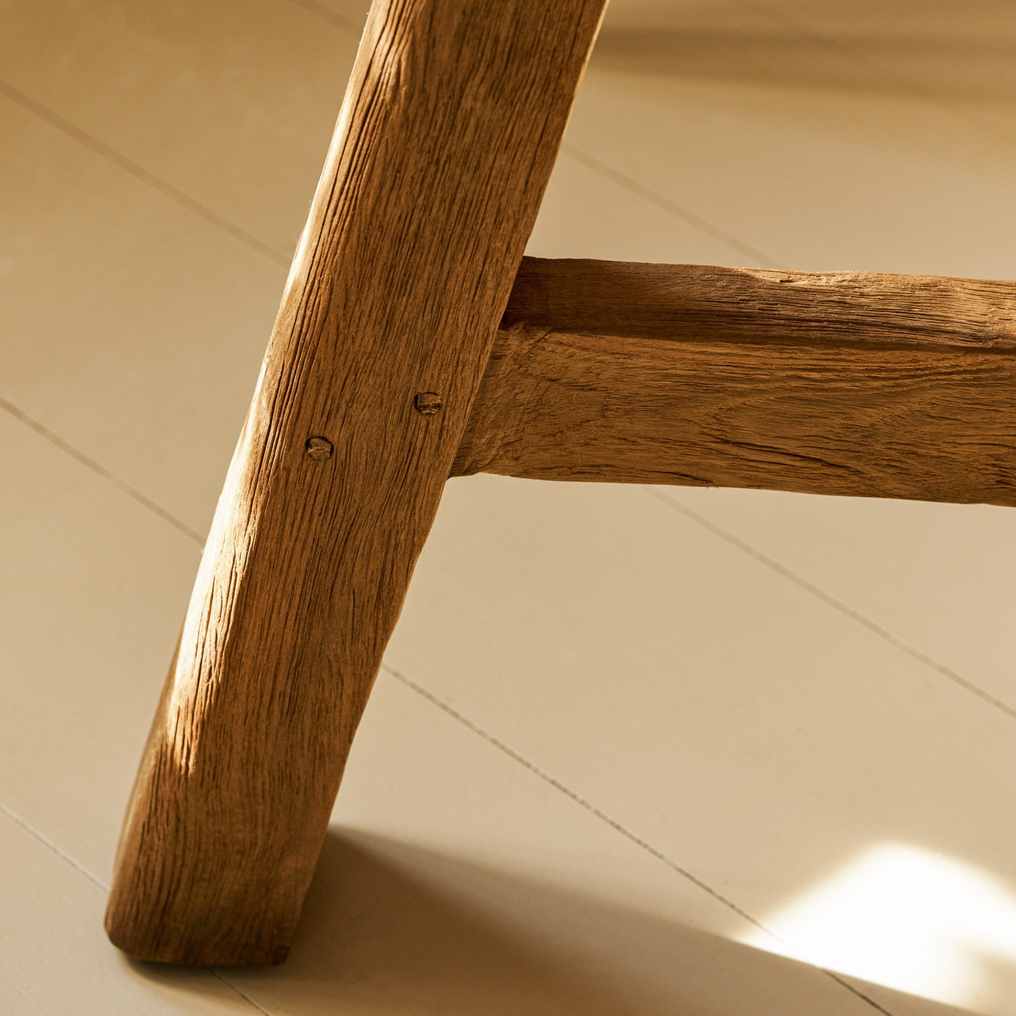 This beautiful table is designed for indoor use only, its hand crafted from solid reclaimed teak therefore each piece will be unique. This table has a natural finish, unvarnished and textured. Please note the reclaimed timber is taken from framework, columns or pillars in Indonesian old homes, so traces of the wood's past life may be visible - holes showing traces of nails, or a past wood joint.