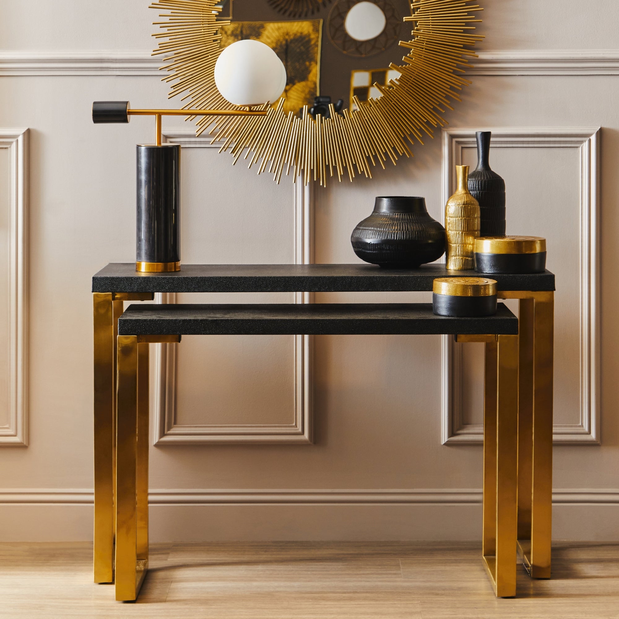 Perfectly designed to nest together, these black and gold console tables offer a smart space-saving solution while maintaining their visual appeal. When tucked as a set, they create a layered look with dimensional charm, while individually they provide flexible styling options throughout the home. Place them together in a hallway for impact, separate them to serve as elegant accent pieces in different rooms, or use them as stylish surfaces for displaying decorative objects, plants or lighting.