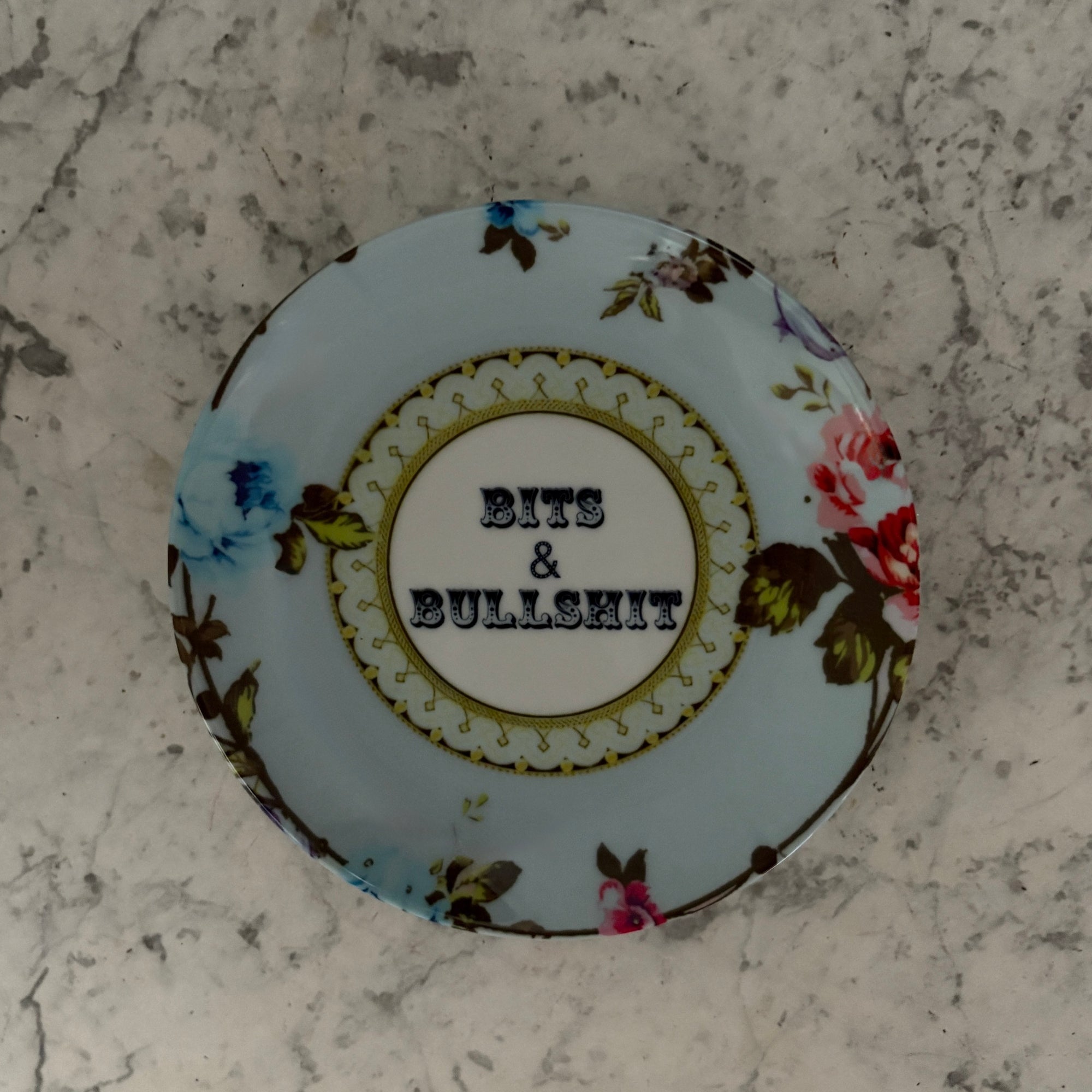 Fun, fabulous, and full of flair, this Trinket Bowl is the perfect blend of pretty and playful. Featuring a charming floral motif contrasted with the unapologetically bold phrase "BITS & BULLSHIT" in black lettering at the centre, this ceramic plate adds a dose of humour and personality to your space.