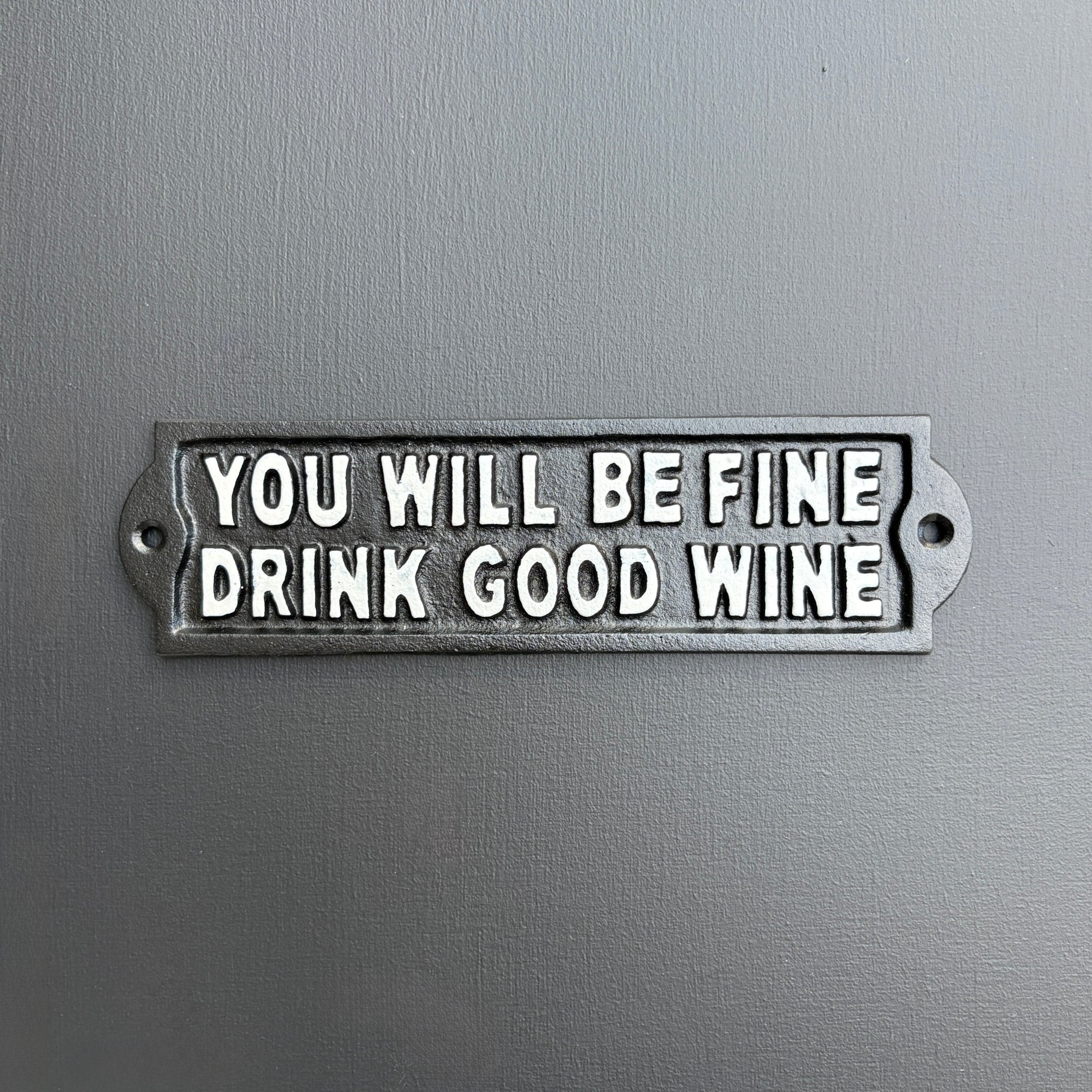 Add charm and a touch of humour to your home with the Wine Sign, crafted from sturdy cast metal for a durable and timeless look. Finished in classic black with bold white lettering, it playfully declares: “YOU WILL BE FINE DRINK GOOD WINE”. The versatile monochrome design ensures this wall sign stands out while still blending seamlessly into a range of décor styles.